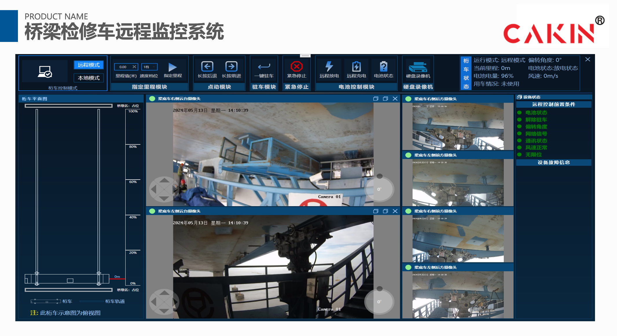 Ø 面向跨海/跨江大桥高危场景打造的远程中枢控制系统,通过精准操控梁底检查车与塔内升降机,搭载高精度云台相机及智能导航模块,实现桥梁底部区域"零接触"巡检,彻底规避人工攀爬风险,将传统3-5天的现场作业压缩至2小时远程操控,大幅提升维检安全性与时效性。